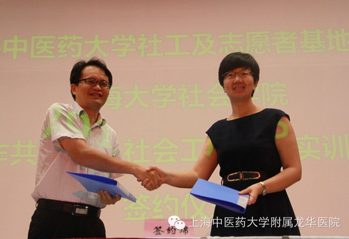 在不断探索医务社工发展道路的同时,联盟与高校联手合作共同打造专业化的服务队伍。会上,市卫计委俞军副处长、上海中医药大学学工部陶思亮部长为医务社会工作教学实践基地揭牌。接着,上海中医药大学医务社工及志愿者服务基地联盟秘书长、龙华医院党委副书记李赣与上海大学社会学院党委书记沈艺,共同签订医务社会工作教学实训基地合约,为今后医务社工建设打下坚实基础。