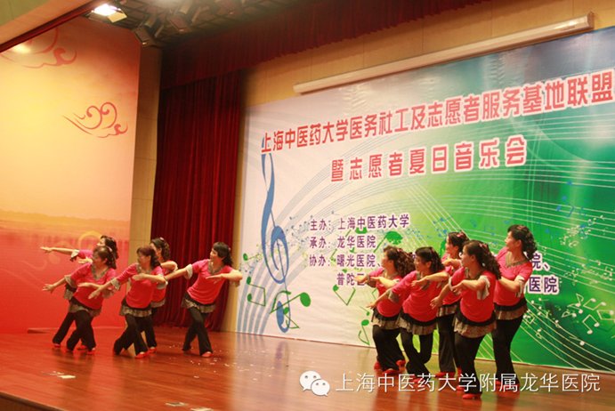 医务社工部、宣传处讯 为了大力弘扬“奉献、友爱、互助、进步”的志愿精神,以及满足患者多层次的服务需求,切实发挥志愿服务在医院的强力支持作用,8月15日下午,在龙华医院举办了“心的承诺,爱的奉献??上海中医药大学医务社工及志愿者服务基地联盟成立暨志愿者夏日音乐会”。出席会议的有上海中医药大学党委副书记朱惠蓉、市文明办活动创建处副处长丁小硕、市卫计委新闻宣传处副处长俞军、华山医院党委副书记耿道颖、上海大学社会学院党委书记沈艺、上海中医药大学附属曙光医院、岳阳中西医结合医院、上海市中医医院、普陀医院、上海市中西医结合医院的党委副书记和社工部负责人,以及龙华医院党政领导、职能科室负责人,六家医院社工及志愿者代表,龙华医院门诊、住院患者和家属也参加了本次音乐会。