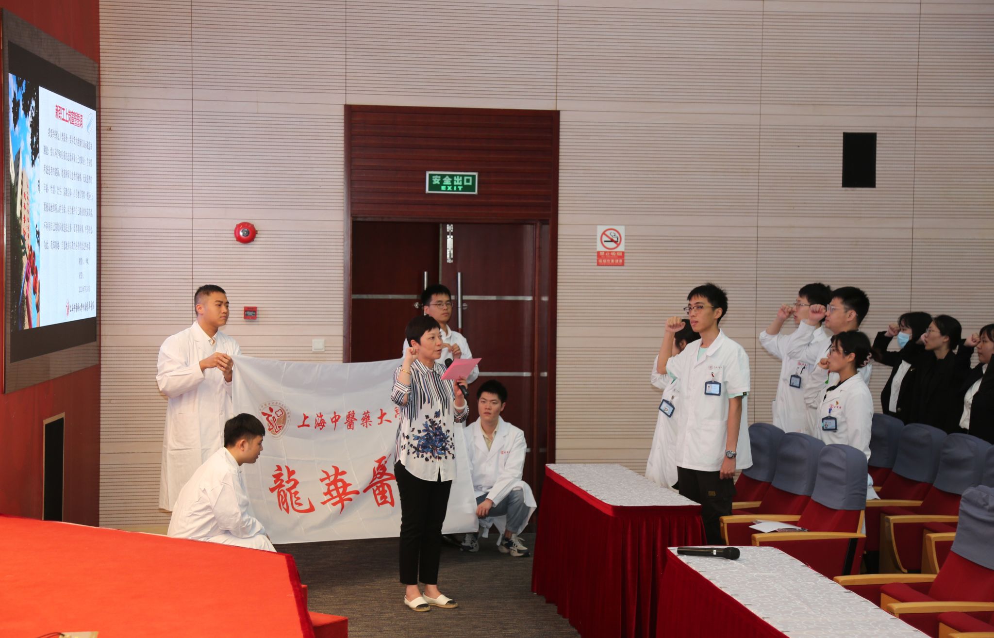 在李屹副院长的领誓下,全体新职工在院旗前进行庄严宣誓,并由全体院领导向新职工代表授予工作服、工作证。