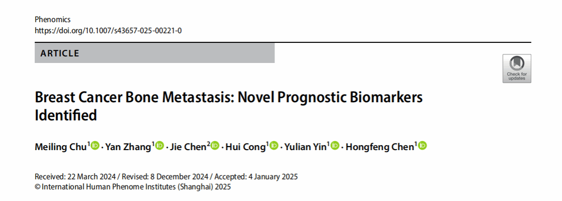 近日,我院陈红风教授、叶媚娜主任医师、殷玉莲副主任医师(通讯作者)带领褚美玲博士、张雁博士研究生(第一作者)等团队成员,在《Translational Oncology》杂志发表题为”Yi Shen Tiao Gan decoction alleviates aromatase inhibitor–related bone loss by promoting H-type vessel formation”的研究论文(Q1区,IF:4.5)、在金力院士主编的本土优秀期刊《Phenomics》杂志发表题为“Breast Cancer Bone Metastasis: Novel Prognostic Biomarkers Identified”的研究论文(Q2区,即时影响因子6.3)。首次在构建HR阳性乳腺癌术后骨丢失动物模型的基础上,从骨内H型血管内皮细胞角度,寻找芳香化酶抑制剂相关骨丢失发病机制,提出益肾调肝方治疗芳香化酶抑制剂相关骨丢失的新靶点SLIT3,为研究中医药治疗骨丢失提供新方向;首次基于WGCNA和机器学习筛选乳腺癌骨转移中的脂质代谢相关生物标志物并研究其调控机制,为乳腺癌患者骨转移的进一步研究提供了科学参考,为深入理解骨转移乳腺癌的机制奠定了理论基础。