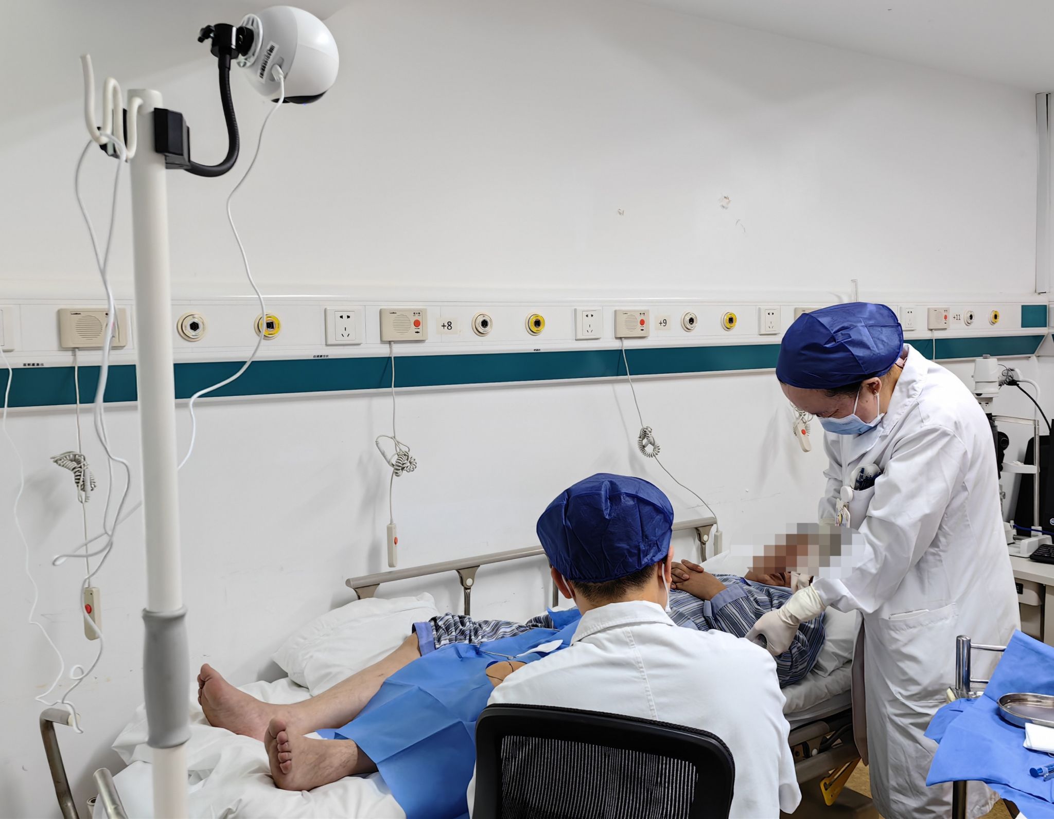 在学员进行模具演练前,南昌大学一附院杨涛教授和我院风湿免疫科朱竹菁副主任医师共同对病人进行滑膜活检真人操作,滑膜活检过程进行实时同传直播教学,直观范例展示了操作流程及技术要点,这也完成了龙华风湿免疫科第一例滑膜活检术。