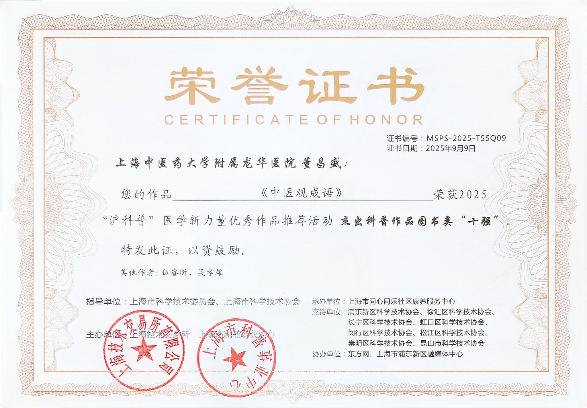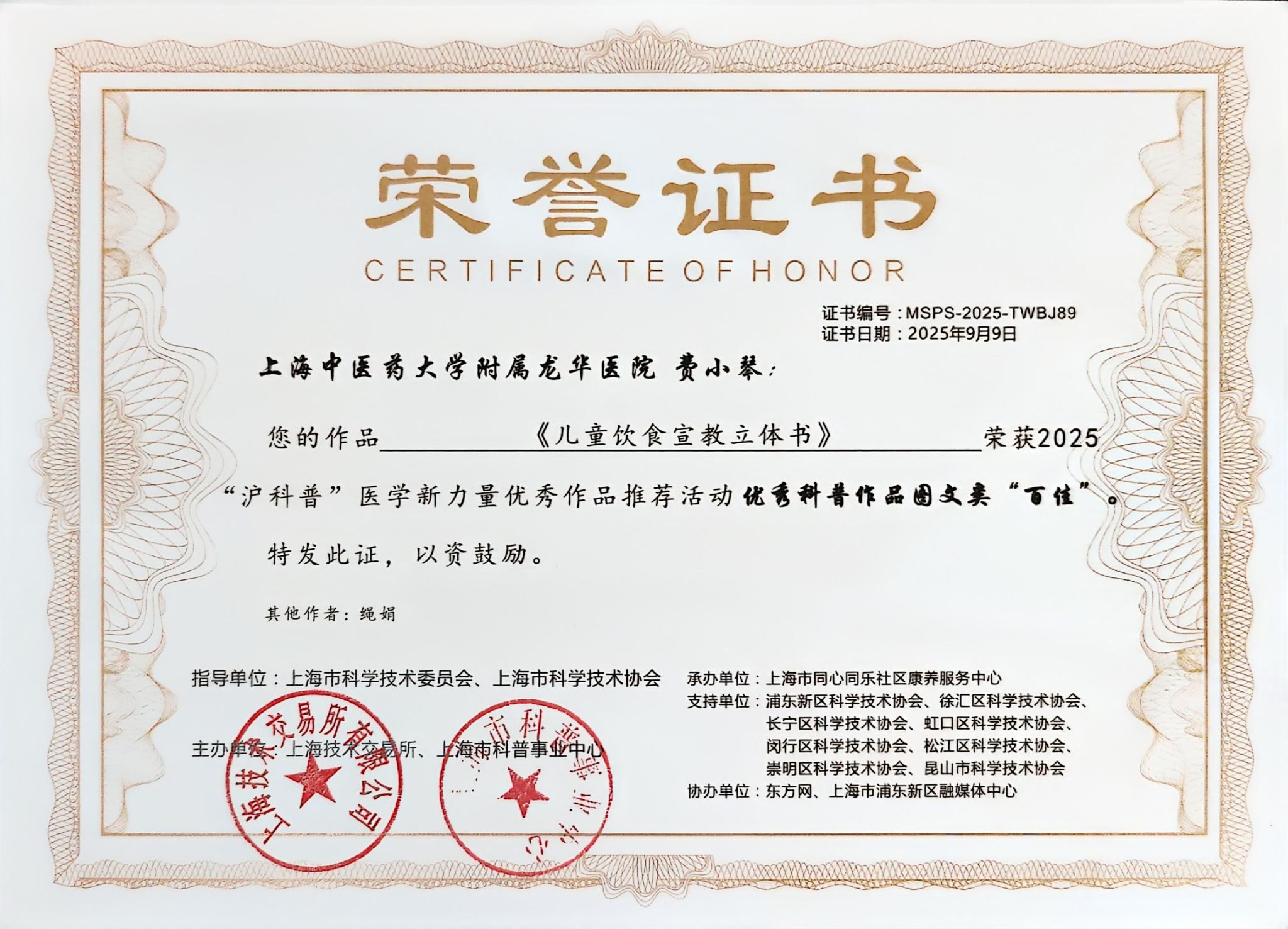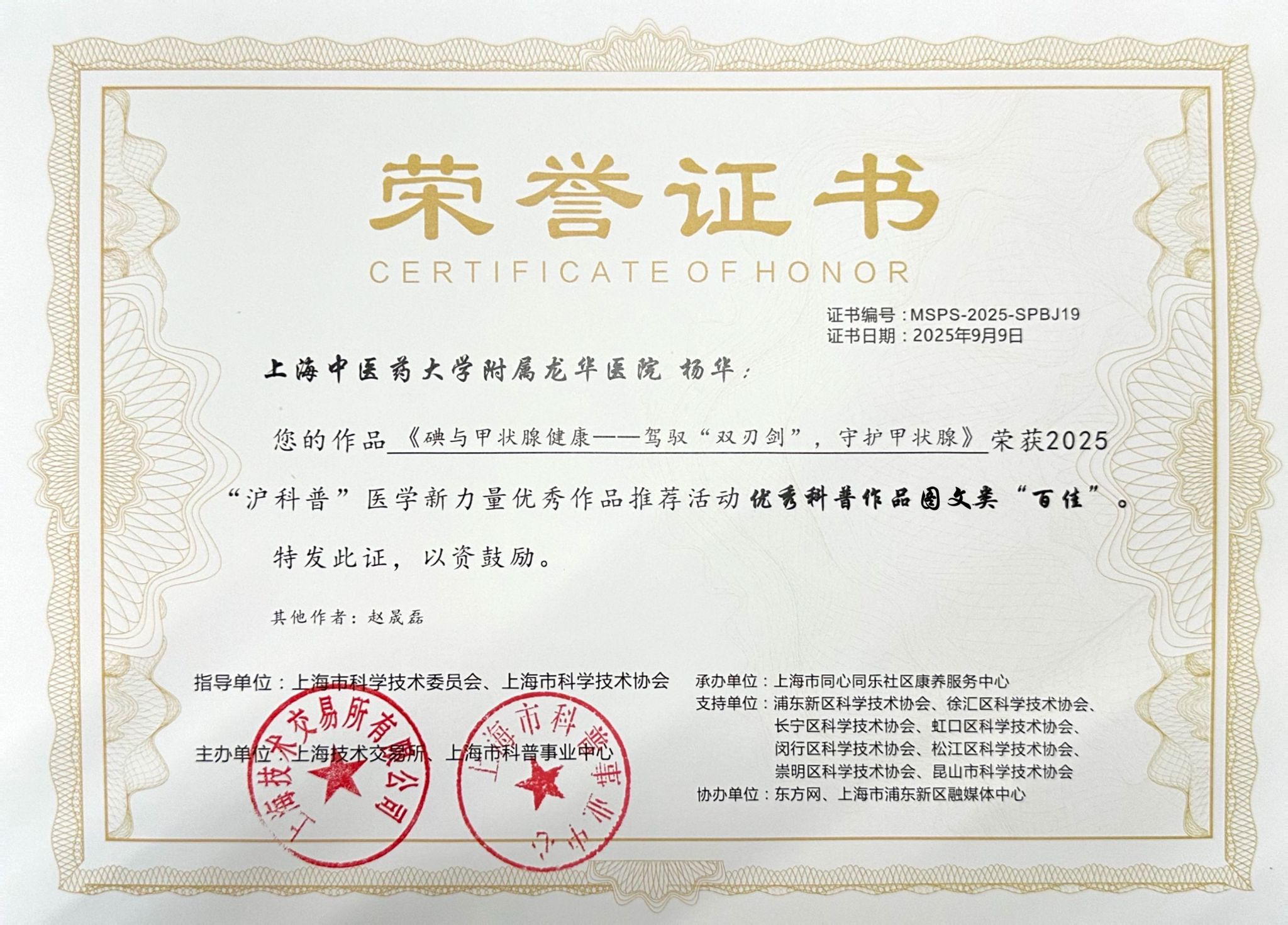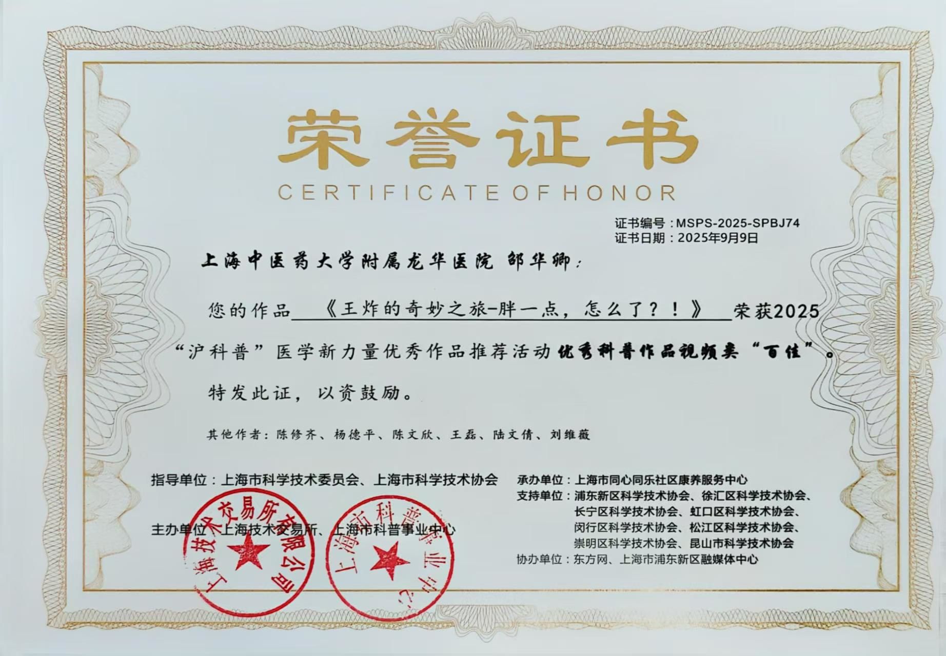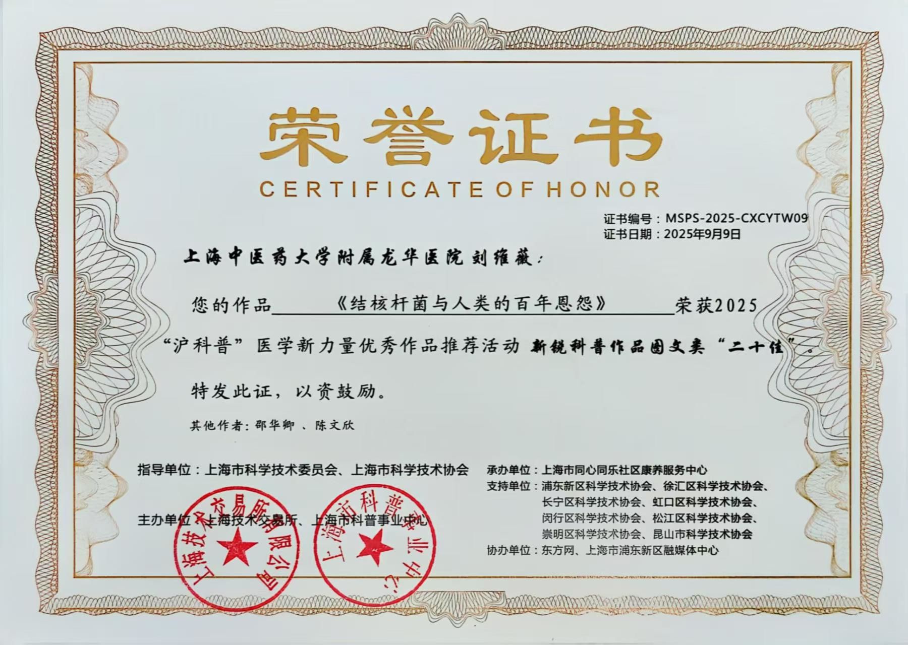 龙华医院荣获优秀组织单位;我院肿瘤研究所董昌盛领衔主编的《中医观成语》荣获杰出科普作品图书类“十强”;检验科刘维薇、邵华卿、陈文欣创作的图文作品《结核杆菌与人类的百年恩怨》荣获新锐科普作品图文类“二十佳”;检验科邵华卿、陈修齐、杨德平、陈文欣、王磊、陆文倩、刘维薇创作的科普视频《王炸的奇妙之旅——胖一点,怎么了?!》 荣获优秀科普作品视频类“百佳”;儿科费小琴、绳娟创作的《儿童饮食宣教立体书》荣获优秀科普作品图文类“百佳”;内分泌科杨华、赵晟磊创作的图文作品《碘与甲状腺健康——驾驭“双刃剑”,守护甲状腺》荣获优秀科普作品图文类“百佳”;内分泌科夏弋钦、杨华创作的图文作品《红楼梦之林妹妹患甲状腺癌》荣获优秀科普作品图文类“百佳”。