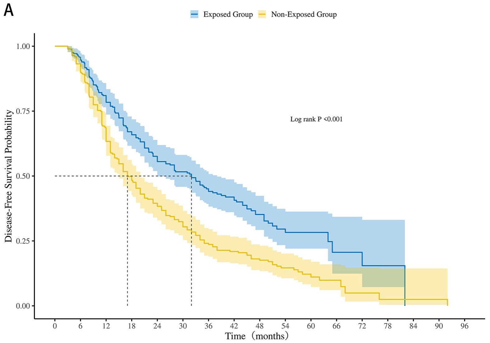 Fig. 2 A Kaplan–Meier analysis of DFS in the exposed and non-exposed groups.