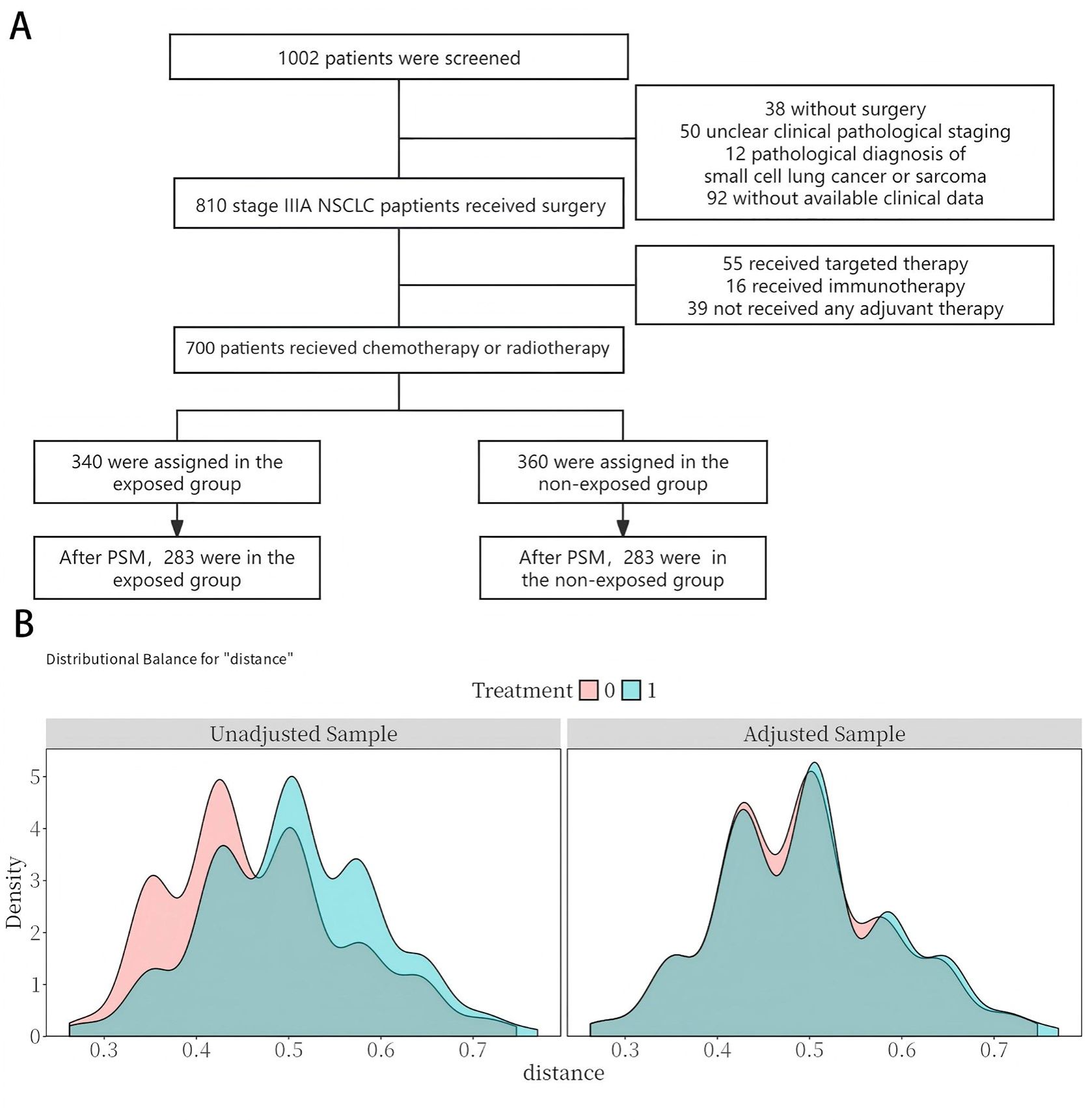 Fig. 1 A Flowchart of this study. B Probability density distributions before and after PSM. 0 means the non-exposed Group; 1 means the exposed group