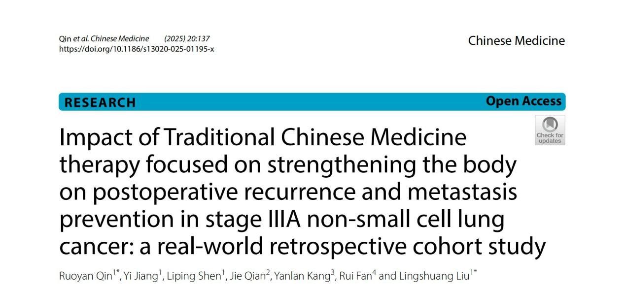 我院肿瘤科刘苓霜研究团队长期致力扶正治癌学术思想的传承和发扬,探索扶正为主防治非小细胞肺癌(NSCLC)术后复发转移是其主要研究方向之一。近年来,团队聚焦IIIA期NSCLC这一复发转移风险高的人群开展了系列研究,此次报道基于真实世界数据,通过回顾性队列研究,证实了扶正为主的中医药治疗在预防IIIA期NSCLC术后复发转移中的确切疗效,2025年8月29日,研究成果发表于国际期刊《Chinese Medicine》(IF=5.7),为中医药在肺癌辅助治疗中的推广运用再添有力的循证依据。该研究得到了上海交通大学附属胸科医院及同济大学附属肺科医院同道的大力支持。