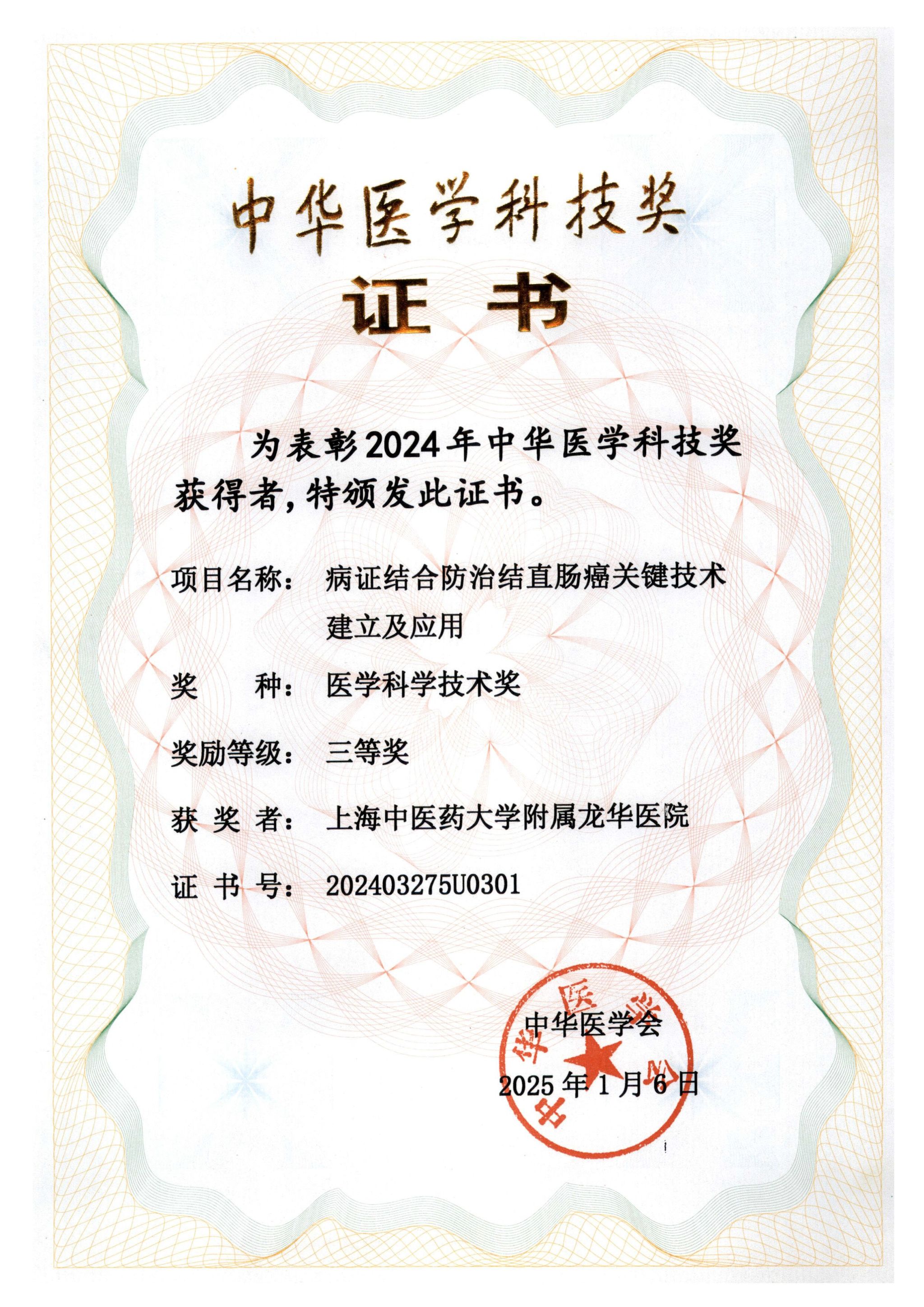 9月19日上午,中华医学会在北京国家会议中心召开庆祝中华医学会成立 110 周年暨中华医学科技奖颁奖大会,会上为 2024 年中华医学科技奖获奖代表颁奖。我院徐汉辰研究员领衔项目“病证结合防治结直肠癌关键技术建立及应用”荣获中华医学科技奖三等奖。