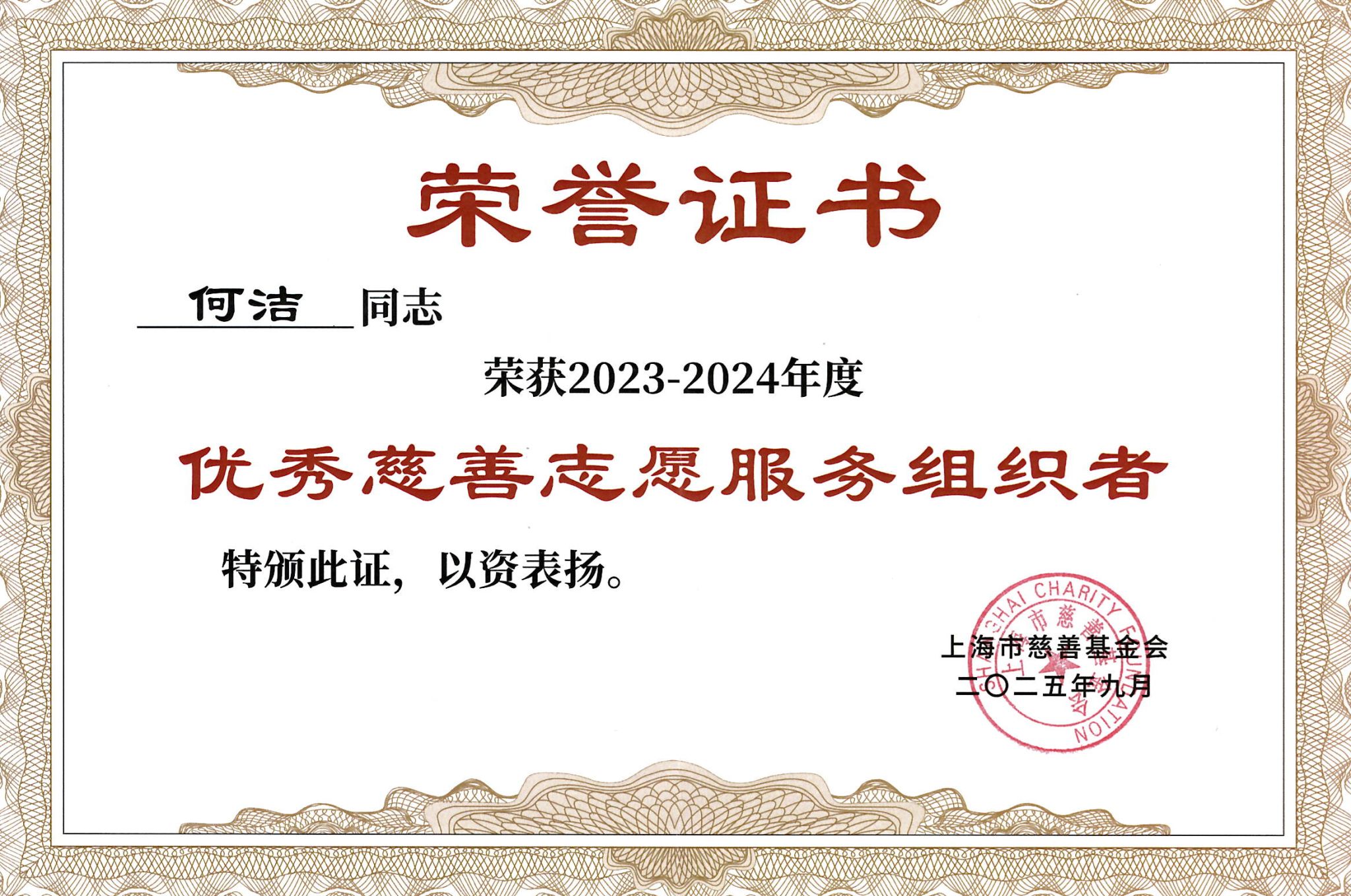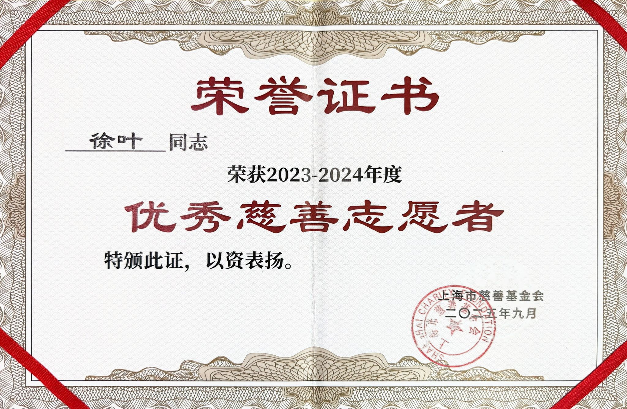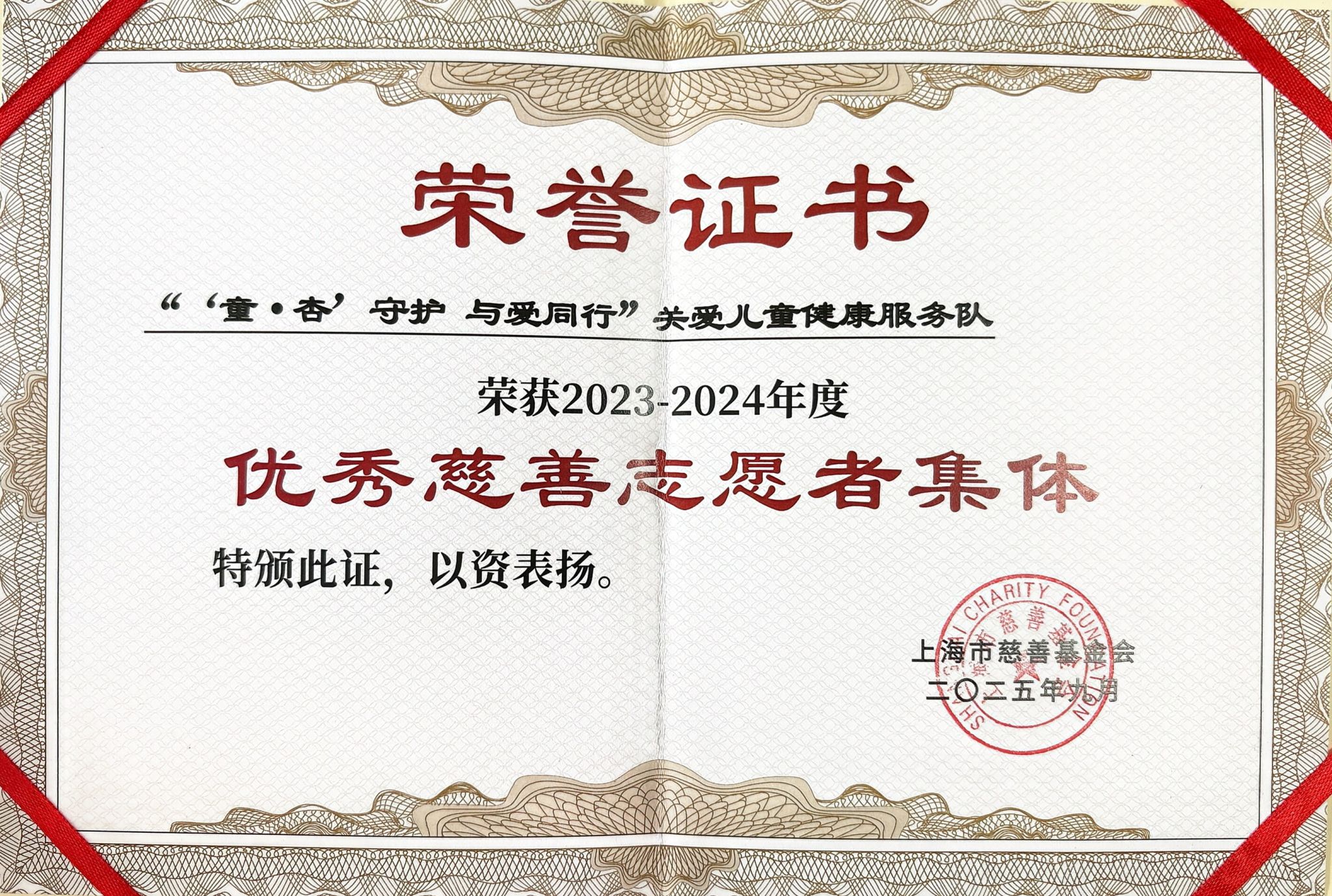 为进一步弘扬慈善文化和志愿精神,肯定慈善志愿者为慈善事业发展所作出的贡献,激励更多社会爱心人士参与慈善志愿服务,上海市慈善基金会开展了2023-2024年度上海市慈善基金会优秀慈善志愿者集体、个人、组织者的选树工作,经评选,我院“童杏守护与爱同行”关爱儿童健康服务队获2023-2024年度优秀慈善志愿者集体,中医助聋门诊徐叶医生获优秀慈善志愿者,何洁获优秀慈善志愿服务组织者。