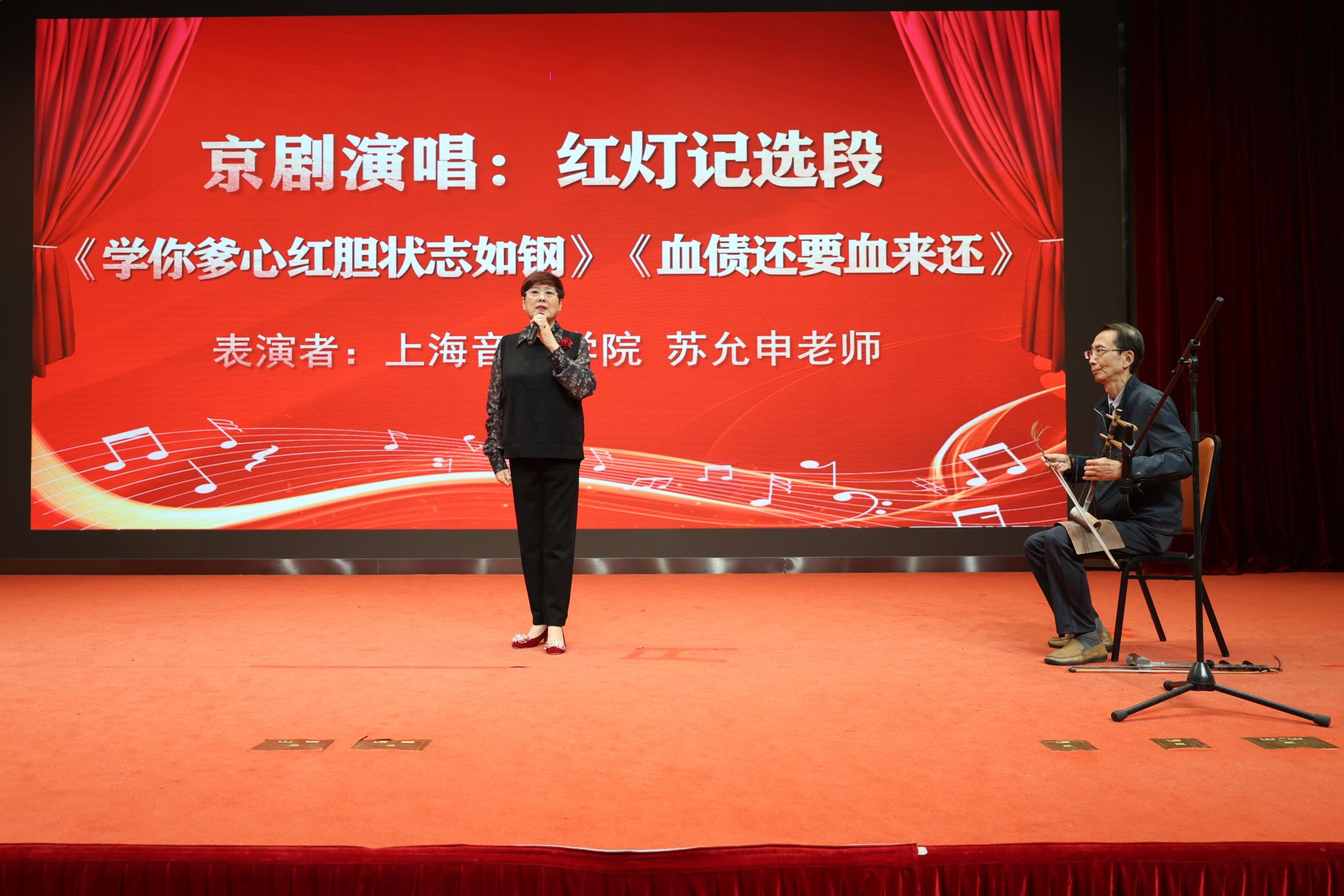 我院离退休党委与上海音乐学院离退休党委党建共建邀请了上音学院退休教师苏允申带来了特别节目,她表演的革命现代京剧《红灯记》选段铿锵有力,饱含深情,赢得台下阵阵掌声。