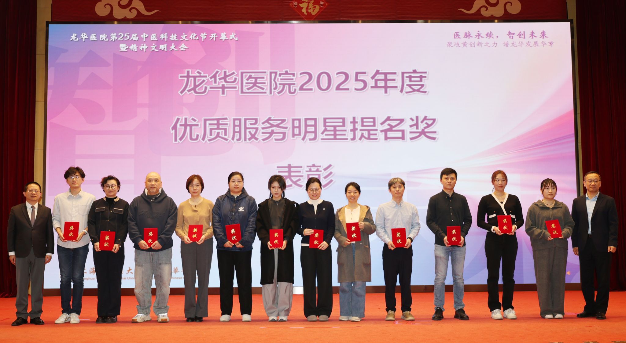 为了培育和践行社会主义核心价值观,树立正面典型,强化道德引领,我院开展了2025年龙华医院社会主义精神文明好人好事及2025年“诚暖杏庭”优质服务明星的评选活动,朱亮副书记宣读获奖名单,并与徐军学总会计师共同向获奖者颁发证书。