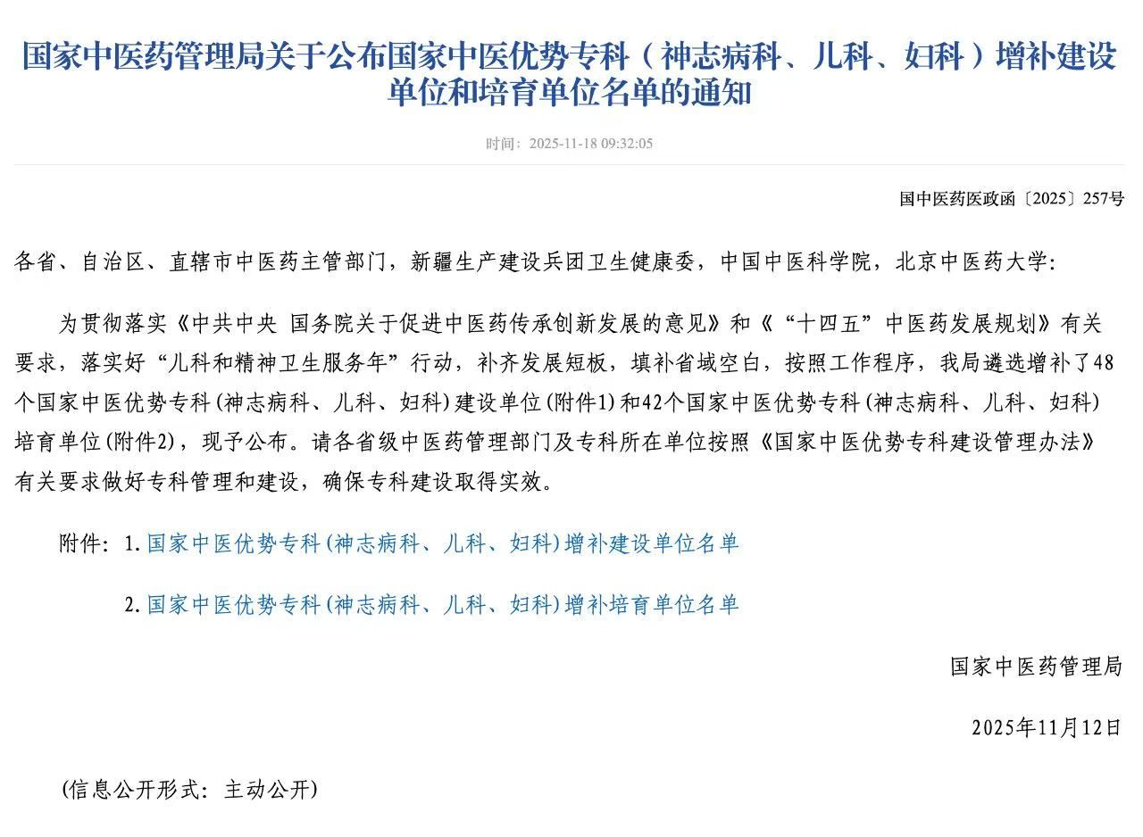 近日,国家中医药管理局发布通知,公布国家中医优势专科(神志病科、儿科、妇科)增补建设单位和培育单位名单,遴选增补了48个国家中医优势专科(神志病科、儿科、妇科)建设单位,我院神志病科、儿科、妇科成功入围。