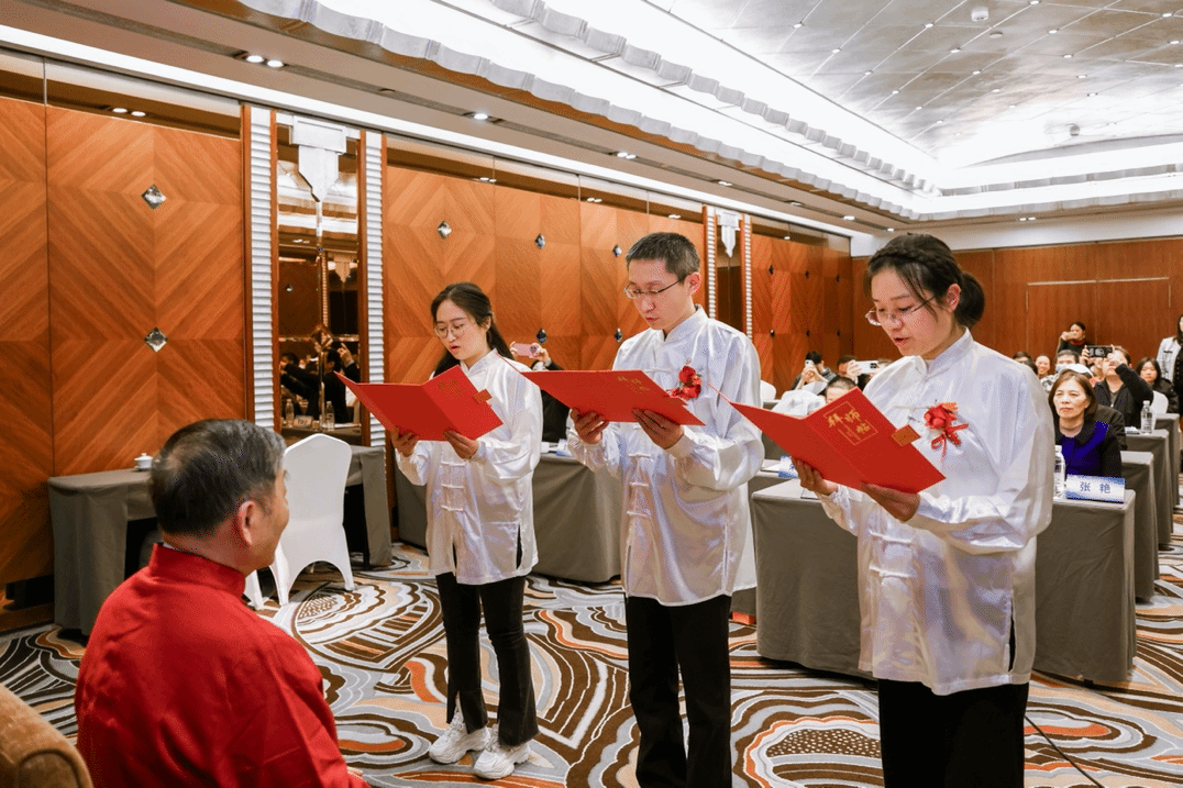 来自上海中医药大学附属龙华医院感染科、代谢疾病诊疗中心的3位弟子王磊、王春燕、朱金霞依次向国医大师行鞠躬礼、敬茶献花、呈拜师帖,并齐读拜师帖,正式成为杨震的师承弟子。杨震大师向弟子回赠自己编著的书籍《杨震相火气机学说研习实践录》并合影,鼓励弟子们勤勉好学,传承中医文化。
