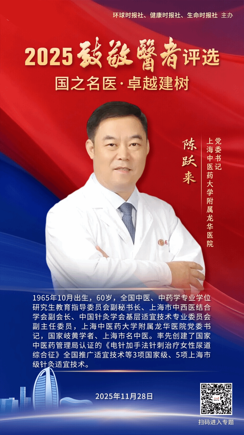 陈跃来教授师承著名针灸学家郑魁山教授等名师,深耕中医针灸三十余载,聚焦泌尿生殖系统疑难病。他创新“骶穴针刺技术”,破解压力性尿失禁等“社交癌”困扰,建立前列腺癌术后针灸康复方案,让无数患者重获健康与尊严。临床与科研并举,他牵头50余项国家级课题等,成果获13项省部级奖励,论文登载JAMA等顶刊。他成立了上海国际针灸医学中心,推动“中国银针”走向世界,他还牵头成立上海市中医盆底疾病康复专科联盟及睡眠医学中心,制定系列治疗方案和技术,更助力优质中医资源下沉基层。以针为器,以仁为魂,陈跃来教授的这份荣誉,是对其医者担当的最佳褒奖,也是龙医人中医药传承创新的生动写照。