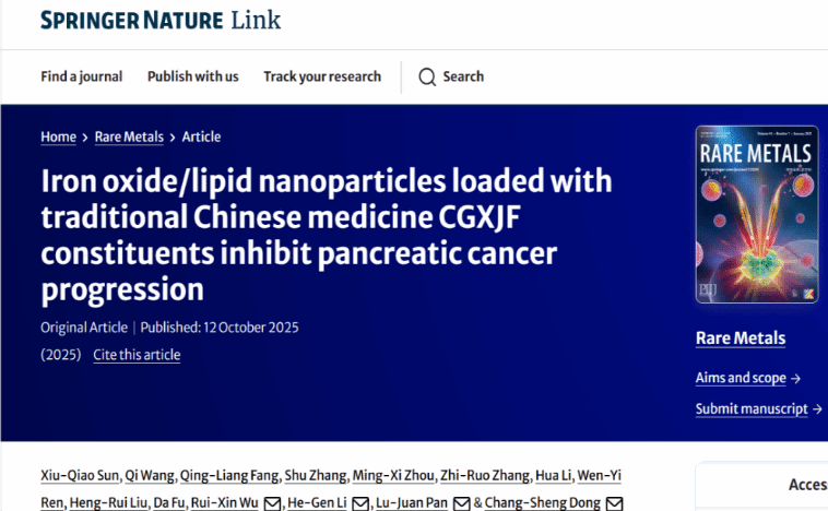 近日,我院肿瘤学科董昌盛/李和根/方庆亮联合团队在中科院一区TOP期刊《Rare Metals》发表题为“Iron Oxide/Lipid Nanoparticles Loaded with Traditional Chinese Medicine CGXJF Constituents Inhibit Pancreatic Cancer Progression”的研究成果(IF=11)。该研究成功揭示在国医大师刘嘉湘教授扶正治癌思想指导下的疏肝健脾复方柴桂消积方(CGXJF)及其君药核心单体人参皂苷RB1(GRB1)抗胰腺癌潜力及神经免疫调控机制,并成功构建了负载GRB1的氧化铁/脂质纳米载体,为胰腺癌的中医治疗提供新策略。