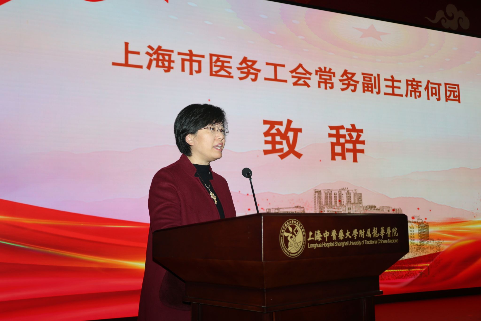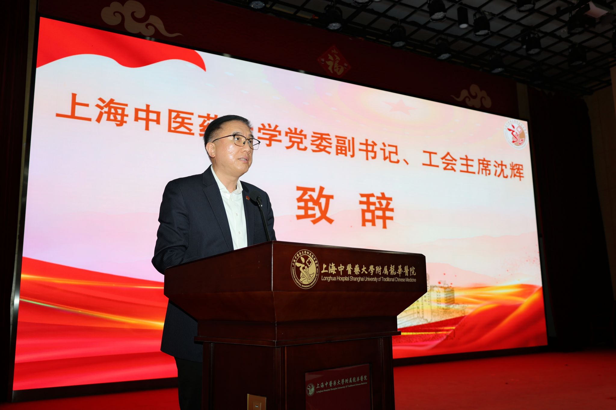 上海中医药大学党委副书记、工会主席沈辉,上海市医务工会常务副主席何园莅临指导并致辞。大会由龙华医院党委副书记、副院长、工会主席朱亮主持。