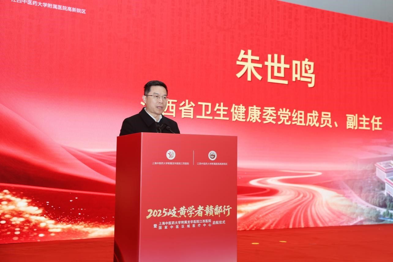 朱世鸣代表省卫健委对医院的建成启用表示祝贺,他指出,上海龙华医院江西医院的启航,是沪赣两地深化中医药合作的重要里程碑,更是落实国家区域医疗中心建设部署的担当使命,让江西百姓在家门口就能享受到国家级优质中医药服务,有效推动优质医疗资源下沉,进一步降低跨省异地就医比例,为江西中医药事业高质量发展注入强劲动力。朱世鸣表示,“2025岐黄学者赣鄱行”活动的同步启动,国医大师、岐黄学者等中医药领域的顶尖专家来到江西,既是汇聚顶尖智慧的学术盛会,更是赋能中医药高质量发展的生动实践,希望专家学者为我省“十五五”时期人才培养、医疗服务、科技创新、产业发展、文化传承等方面贡献智慧和良策,让顶尖岐黄智慧扎根赣鄱沃土,助力中医药强省建设再上新台阶。