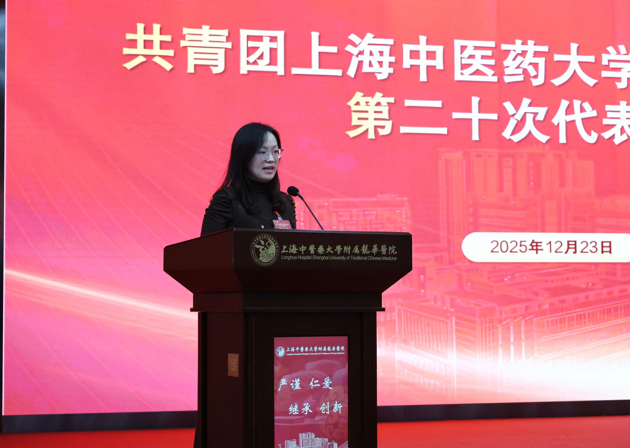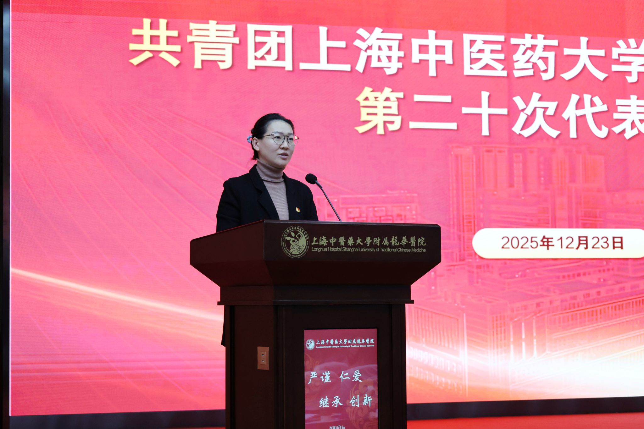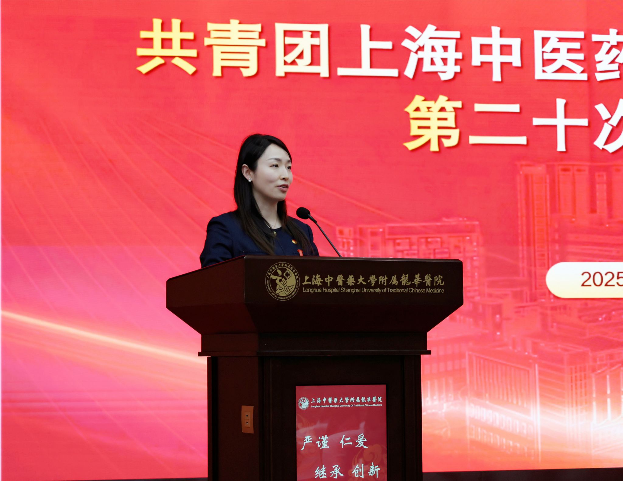 上海中医药大学团委书记万婕致辞。她充分肯定龙华医院第十九届团委班子的工作成效,并寄语新一届团委班子站在新的历史起点上坚定理想信念,勇挑重担,扎实奋斗,在深学细悟中把牢青春航向,在服务大局中彰显青春作为,在改革创新中激发青春活力,将共青团的引领力、组织力、服务力切实转化为服务医院和大学高质量发展的贡献度。