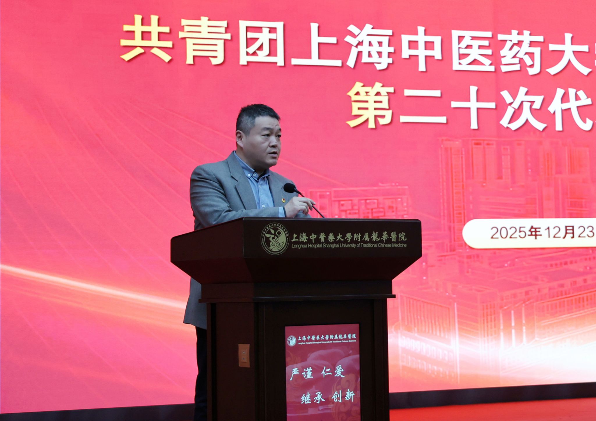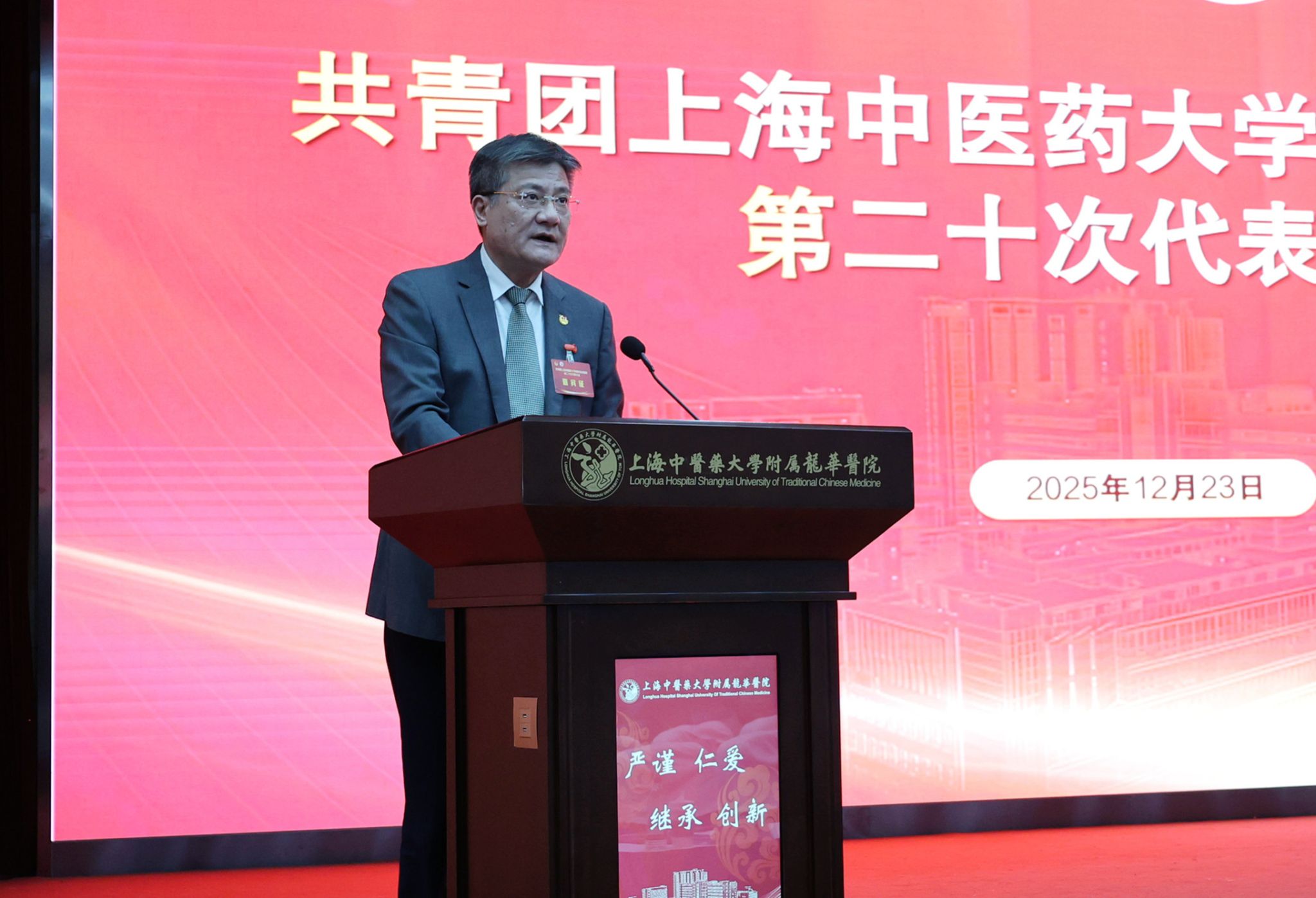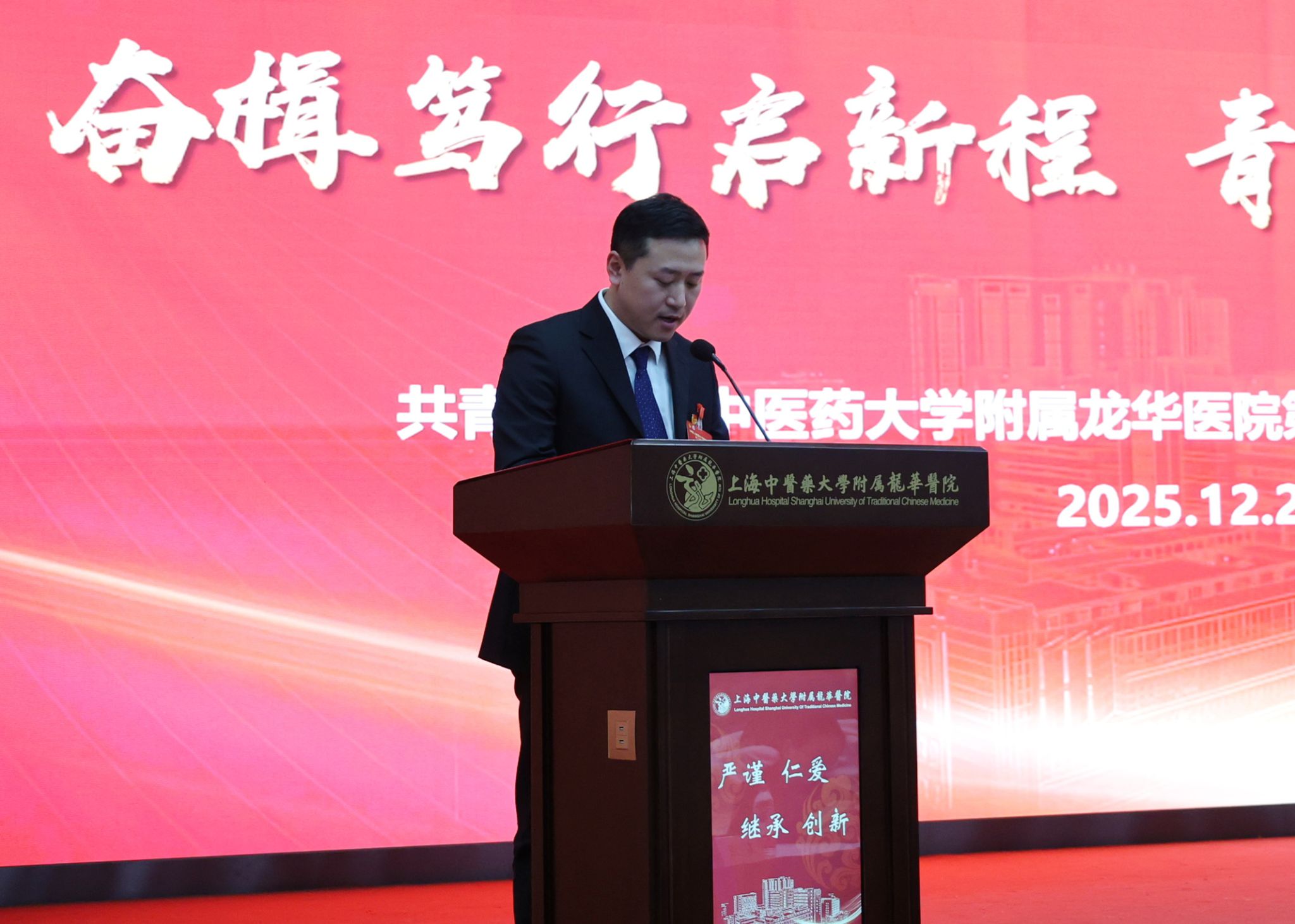 上海中医药大学团委书记万婕致辞。她充分肯定龙华医院第十九届团委班子的工作成效,并寄语新一届团委班子站在新的历史起点上坚定理想信念,勇挑重担,扎实奋斗,在深学细悟中把牢青春航向,在服务大局中彰显青春作为,在改革创新中激发青春活力,将共青团的引领力、组织力、服务力切实转化为服务医院和大学高质量发展的贡献度。