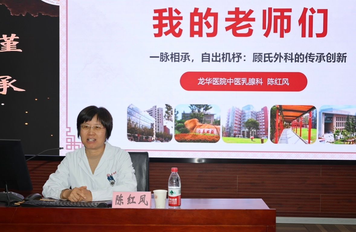 会上,陈红风教授以“我的老师们”为主题,深情回顾了师从顾伯华、陆德铭、唐汉钧、陆金根等名家的学习经历,阐述了顾氏外科“精于医术、诚于患者、笃于信念”的流派精神。她结合自身1991年博士毕业至今三十余年的临床、教学与科研历程,生动展示了如何在百年流派根基上实现守正创新。从浆细胞性乳腺炎(粉刺性乳痈)的中医综合治疗规范建立;到拖线疗法、垫棉绑缚法、熏洗法等外治技术的现代化研究;再到三阴性乳腺癌术后转移的中医药防治探索,陈红风教授系统分享了顾氏外科在诊治疑难乳腺病方面的学术思想与临床经验。同时,她强调“临床是源头活水,科研是升华引擎”,鼓励青年医师坚持辨病与辨证相结合,既要扎根经典,又要勇于运用现代科技阐释中医机理,在传承中开拓创新。“创新是最大的发展,精诚是毕生的修行!”。