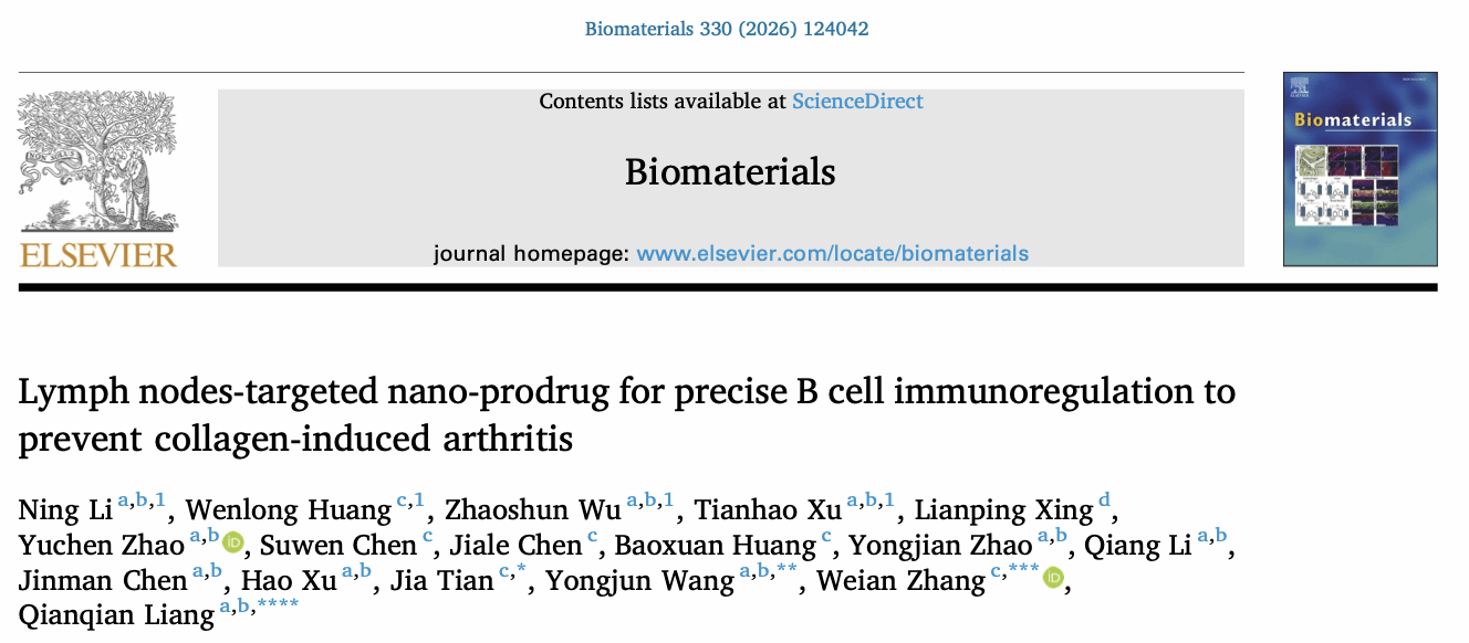 2月12日,龙华医院梁倩倩教授、王拥军教授团队,联合华东理工大学张伟安教授、田佳副研究员团队,在国际知名期刊《Biomaterials》(IF:12.9)在线发表了题为《Lymph nodes-targeted nano-prodrug for precise B cell immunoregulation to prevent collagen-induced arthritis》的研究论文。该研究创新性地构建了一种靶向淋巴结的光控释放纳米前药(HC-IBR),在类风湿关节炎(RA)动物模型中证实了其预防效果及机制,为中医“治未病”思想转化为精准预防策略提供了重要的实验依据。
