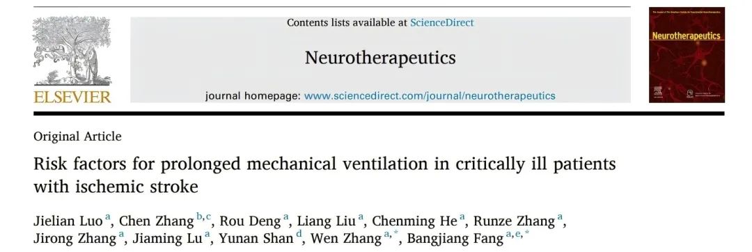 近日,上海中医药大学急危重症研究所所长、我院急诊科主任方邦江教授作为通讯作者,上海中医药大学博士研究生罗杰莲作为第一作者,在国际知名医学期刊《Neurotherapeutics》(JCR一区,影响因子6.9)发表题为“Risk factors for prolonged mechanical ventilation in critically ill patients with ischemic stroke”的研究论文。该研究系统分析了缺血性卒中危重患者延长机械通气(PMV)的危险因素,为重症卒中患者呼吸管理的早期风险评估和临床决策提供了重要依据。该研究彰显了方邦江教授团队在重症脑病领域中西医结合救治的突出成果。