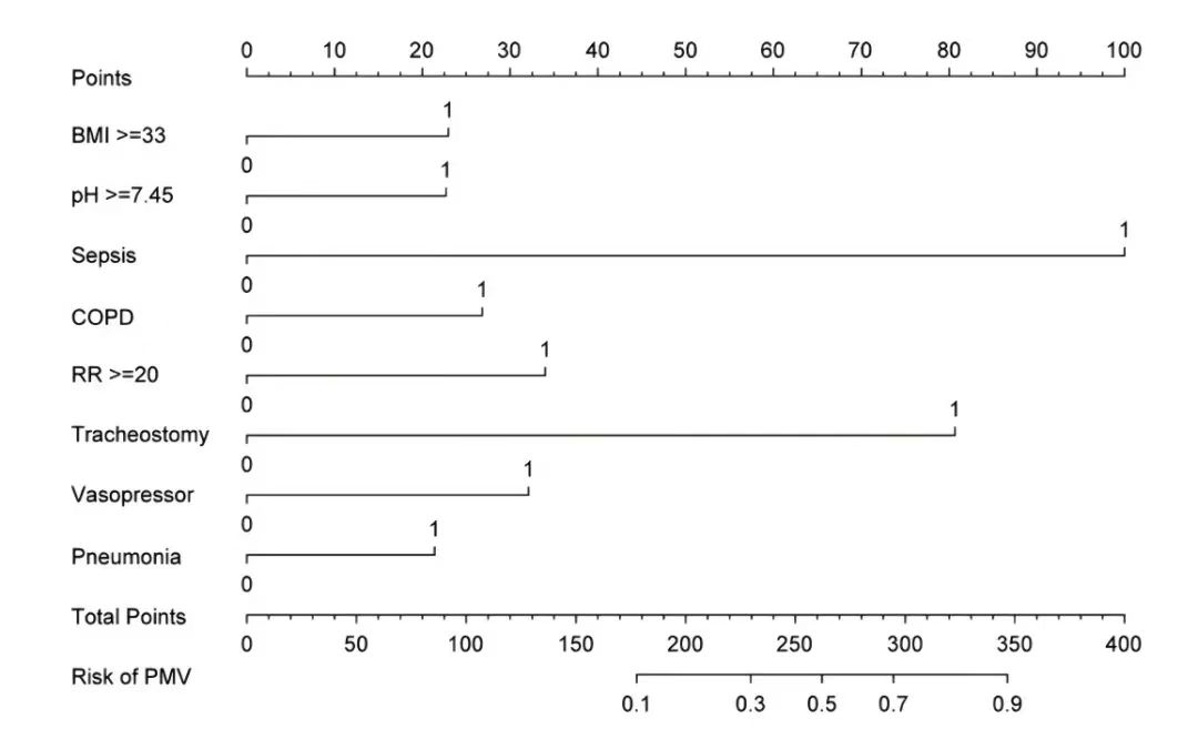 本研究采用回顾性队列设计,分析真实世界大型重症数据库 MIMIC-IV 的临床数据,不仅筛选出 PMV 的独立危险因素,还构建了便于床旁应用的预测模型。