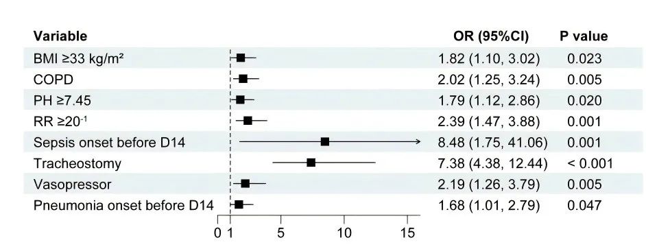研究最终确定8个独立危险因素,包括:包括肥胖(BMI ≥33 kg/m²)、慢性阻塞性肺病(COPD)、碱血症(PH ≥ 7.45)、呼吸频率 ≥20 次/分、14 天内发生脓毒症或肺炎、气管切开和血管加压药使用。