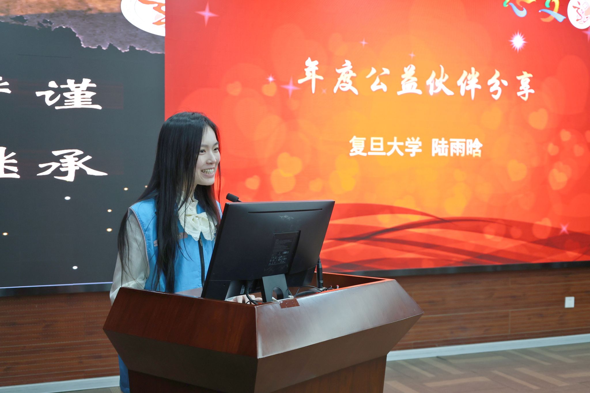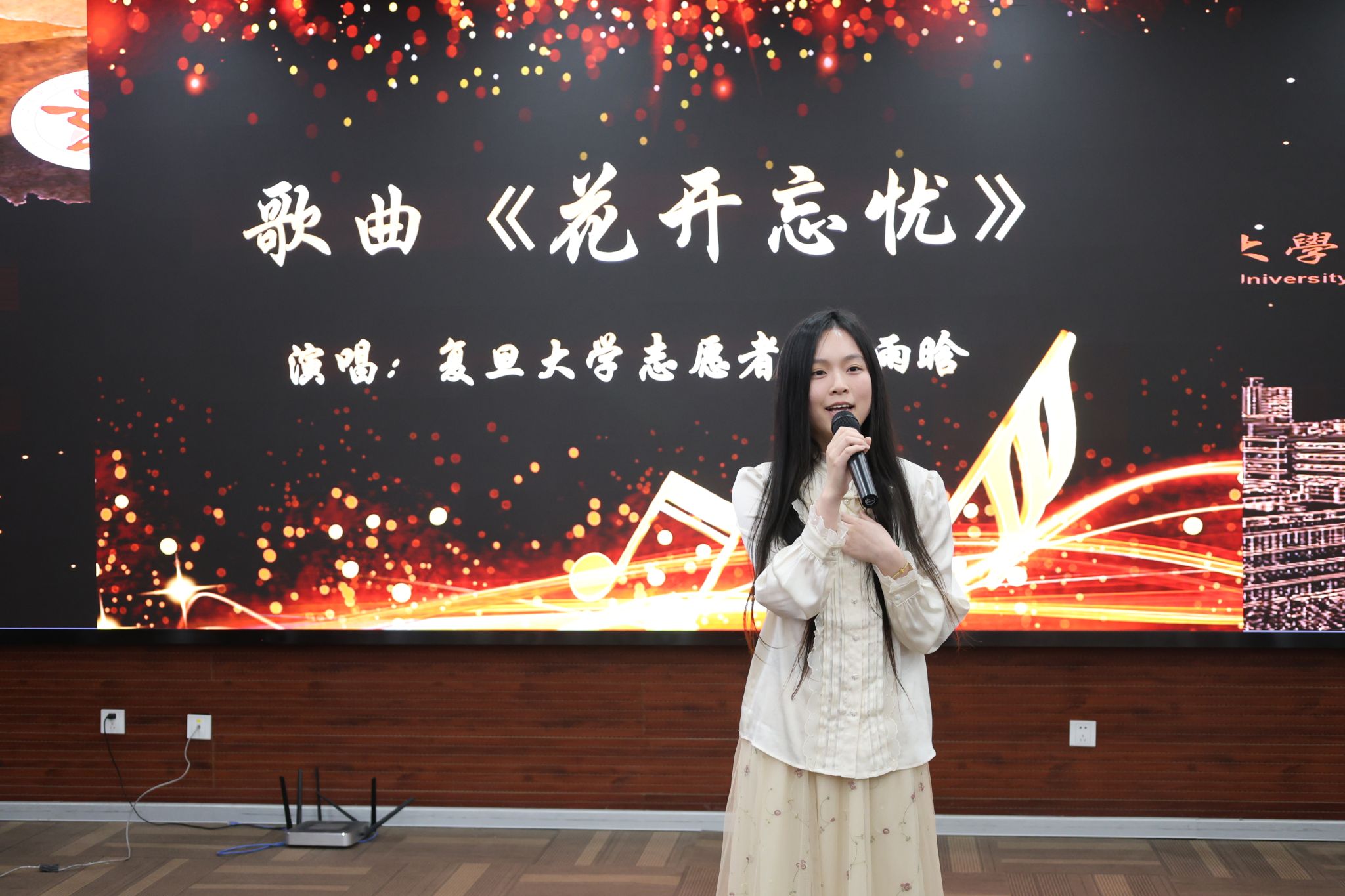 复旦大学公共卫生学院志愿者陆雨晗带来《花开忘忧》演唱,让大家感受歌声中的美好;