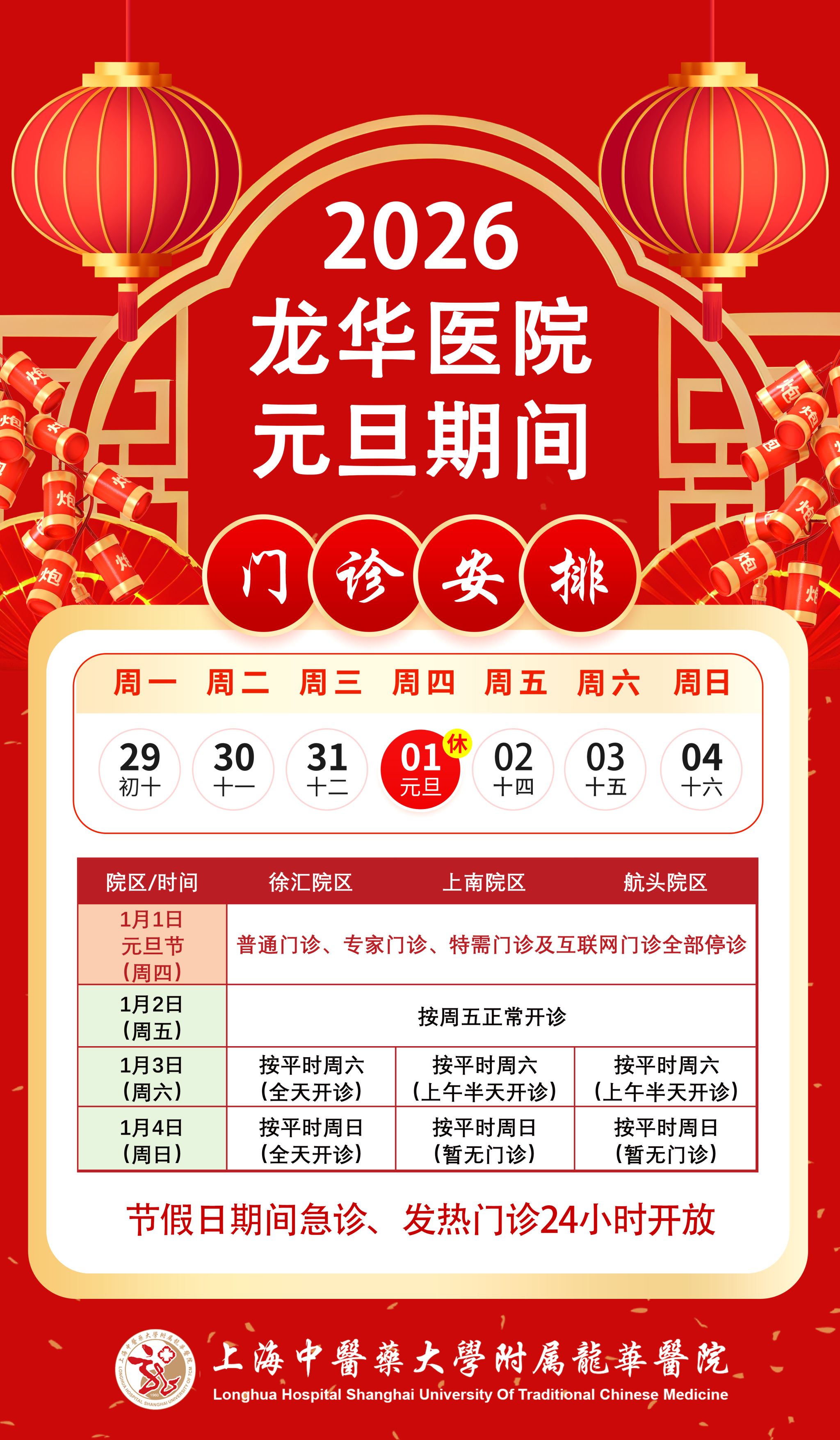 【门诊信息】龙华医院2026年元旦期间门诊安排